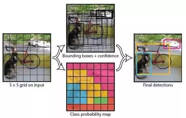 可以看到整个过程非常简单,不再需要中间的region proposal找目标,直接回归便完成了位置和类别的判定。