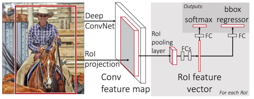 也就是说,之前R-CNN的处理流程是先提proposal,然后CNN提取特征,之后用SVM分类器,最后再做box regression,而在Fast R-CNN中,作者巧妙的把box regression放进了神经网络内部,与region分类和并成为了一个multi-task模型,实际实验也证明,这两个任务能够共享卷积特征,并相互促进。