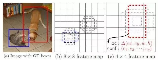 那么如何建立某个位置和其特征的对应关系呢?可能你已经想到了,使用Faster R-CNN的anchor机制。如SSD的框架图所示,假如某一层特征图(图b)大小是8*8,那么就使用3*3的滑窗提取每个位置的特征,然后这个特征回归得到目标的坐标信息和类别信息(图c)。