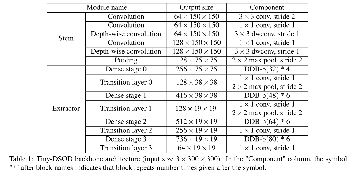 表1:微型DSOD骨干结构(输入尺寸3×300×300)。在“组件”列中,块名后面的符号“*”表示块重复在符号后面给定的次数。