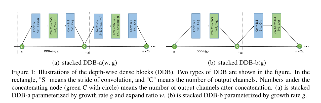 我们提出了两种类型的DDB单元,DDB-a和DDB-b,如图1所示。图1(a)中的DDB-a单元受到MobileNet-v2[27]中提出的新的反向剩余块的启发。它首先将输入信道扩展到w×n,其中n是块输入信道数,w是控制模型容量的整数超参数。然后应用深度卷积,进一步用点卷积(即1×1卷积)将特征映射投影到g信道(g是DDB-a的增长率)。最后,我们使用连接将输入和输出特征映射合并在一起,而不是MobileNet-v2中的剩余加法操作[27]。DDB-a有两个超参数w和g,因此我们将其表示为DDB-a(w,g)。