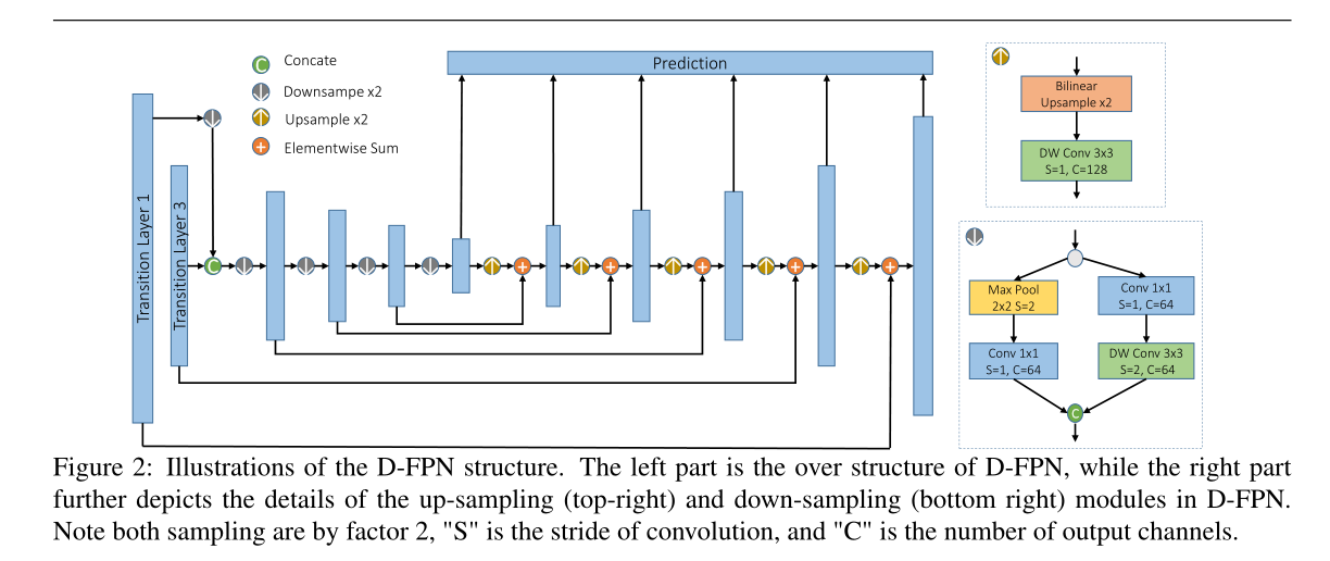 SSD和DSOD的简单结构前端存在浅层预测层缺少对象语义信息的局限性。为了克服这个问题,我们借鉴了文献[6]和[20]中的特征金字塔思想,在预测器中设计了一个称为depthwise-FPN(DFPN)的轻量级FPN,将信息流从较深、较小的特征映射重新定向到较浅的特征映射。图2说明了我们的前端预测器的结构,它由一个下采样路径和一个反向上采样路径组成。在许多研究中,反向路径被证明对小目标检测非常有用[6,20,33]。然而,这些工作大多是通过反褶积来实现逆路径的,这在很大程度上增加模型的复杂度。