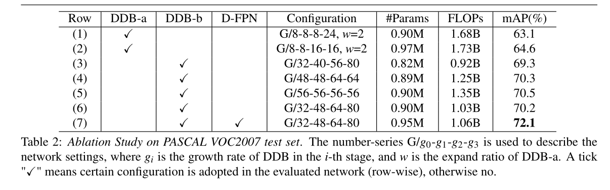 表2:PASCAL VOC2007试验装置的消融研究。数字序列G/g0-g1-g2-g3用于描述网络设置,其中G i是第i阶段DDB的增长率,w是DDB-a的扩展率。勾选“X”表示被评估网络(按行)采用了某种配置,否则为否。