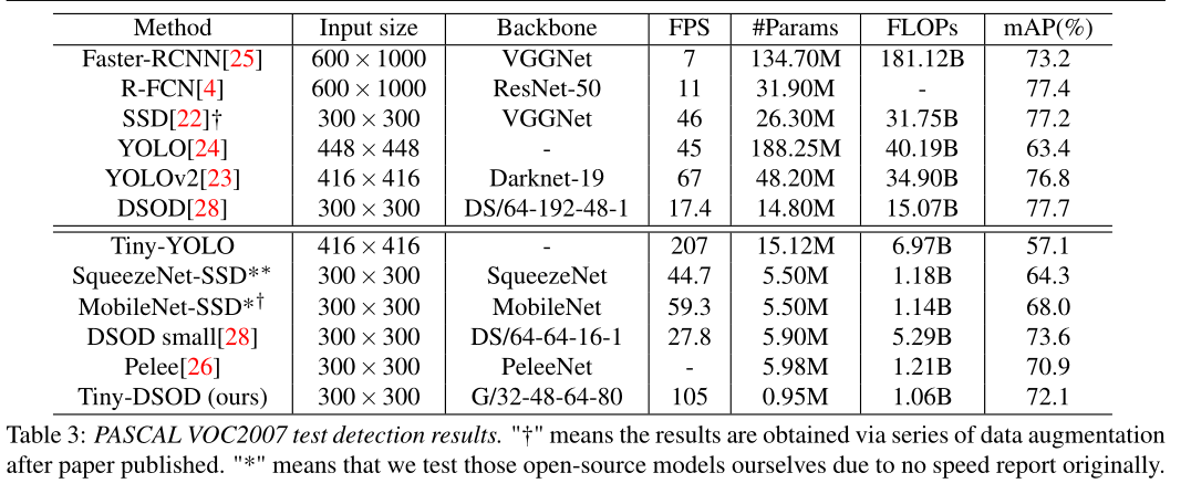 我们在表3中报告了VOC2007测试集的检测结果,其中上部的结果来自于最新的全尺寸检测模型,而下部的结果来自于轻量级检测模型。我们的微型DSOD达到了72.1%的mAP,这明显优于大多数轻量级探测器,除了DSOD最小的[28]。然而,我们的微型DSOD只有1/6的参数和1/5的触发器到最小的DSOD。当将我们的模型与最先进的全尺寸模型进行比较时,仍然存在边际精度下降。然而,微小的DSOD需要更小的持久内存来存储模型,而且计算成本也要低得多。例如,更快的RCNN[25]的精度仅比微小的DSOD高1.1%,而模型尺寸大于140倍,理论计算成本高180倍(实际上,fps速度慢10倍)。这些比较表明,微型DSOD在资源(模型大小和FLOPs)和检测精度之间取得了更好的折衷,这对于资源受限的应用非常有用。