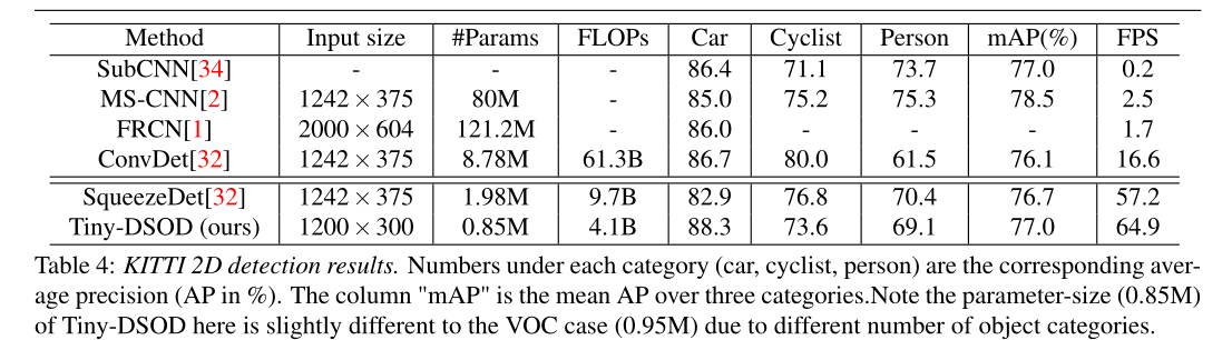 表4:KITTI 2D检测结果。每个类别下的数字(汽车、骑自行车的人、人)是相应的平均精度(AP in%)。“mAP”列是三个类别上的平均AP。请注意,由于对象类别的数量不同,此处微小DSOD的参数大小(0.85M)与VOC情况(0.95M)略有不同。