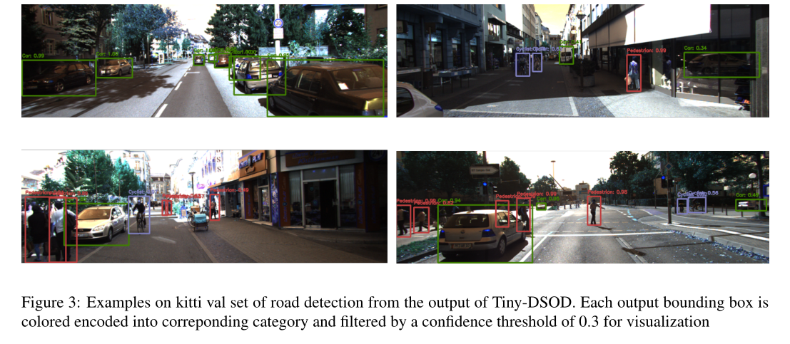 图3:从微型DSOD输出的道路检测的kitti val集示例。每个输出边界框都被着色编码成相应的类别,并通过0.3的置信阈值进行过滤,以便可视化
