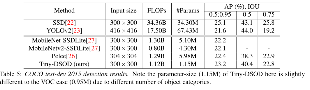试验结果汇总在表5中。微型DSOD在AP@IOU[0.5:0.95]度量的测试开发集上达到23.2%的mAP,优于轻量级的MobileNet SSD(v1&v2)[27]和pelenet[26],甚至优于全尺寸的YOLOv2[23]。此外,微小的DSOD具有显著的小模型比较-表中列出的所有方法。例如,最先进的全尺寸YOLOv2比微型DSOD有58倍大的型号和15.6倍多的触发器。这些比较证明,对于资源受限的目标检测应用,微小的DSOD是有效而准确的。