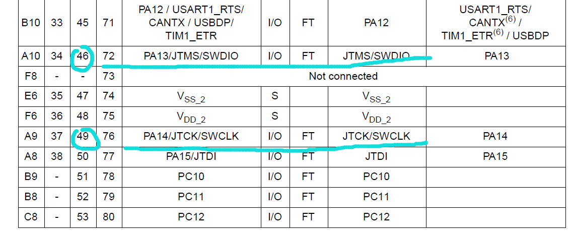 至此,基本排除芯片内部故障,把目光放到芯片外围硬件上,SWD模式下理论上只要有四根线即可识别到单片机,即VCC、GND、SWDIO、SWCLK,其中GND是铺铜处理,不存在断路和虚接的可能,并且上电之后并未出现与VCC短路现象,重新查看芯片手册,确定SWCLK和SWDIO两根线没有画错,并用万用表测试通断皆为通