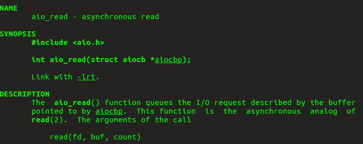 int aio_read(struct aiocb *aiocbp); //在请求进行排队之后立即返回(尽管读操作并未完成)。如果执行成功,返回值为0,失败返回-1,并设置errno的值,aiocb结构体包含了传输的所有信息。
