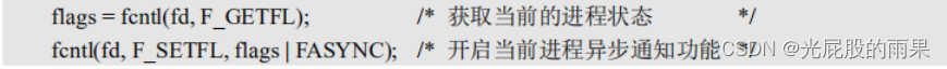 fcntl(fd, F_SETFL, flags | FASYNC); /* 设置进程启用异步通知功能 */