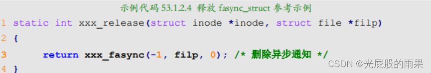 当关闭驱动文件的时候需要在file_operations操作集中的release函数中释放fasync_struct,fasync_struct的释放函数同样为fasync_helper。release函数参数如下;