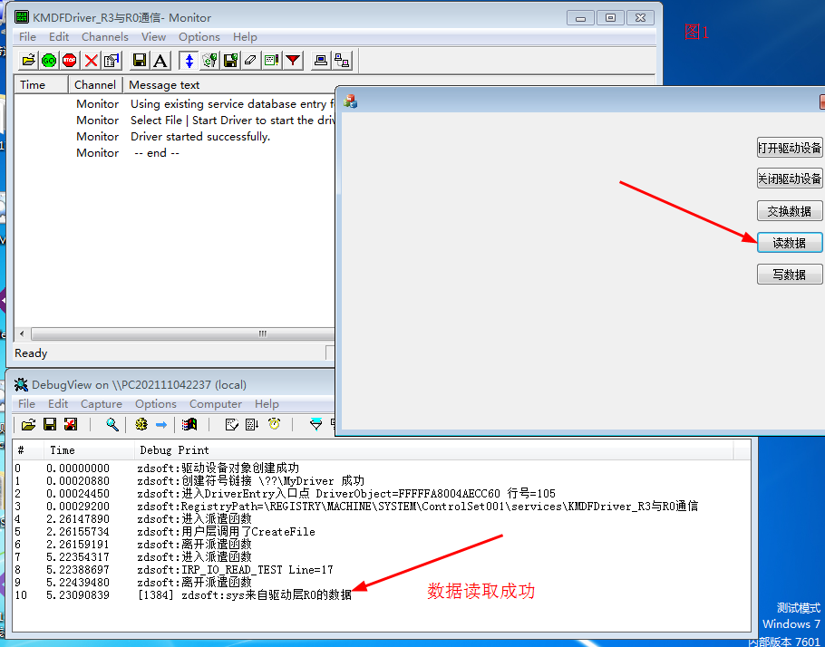 最后编译生成(驱动层生成Debug版,用户层生成Release版),再把生成后的文件复制到虚拟机里,打开相应的调试工具,测试效果如下图(图1):