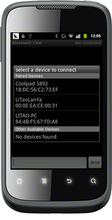 ConnectedThread线程主要负责数据收发,其把从远端收来的数据和要发向远端的数据都会通过handle发送给UI用于在list中显示。对于收数据,这里采用利用线程一直收,一旦收到数据就通过mHandler传递到BluetoothChat进行处理,对于发送数据,没必要采用线程轮流发,而是直接一个函数,什么时候需要就直接调用发送就可以。