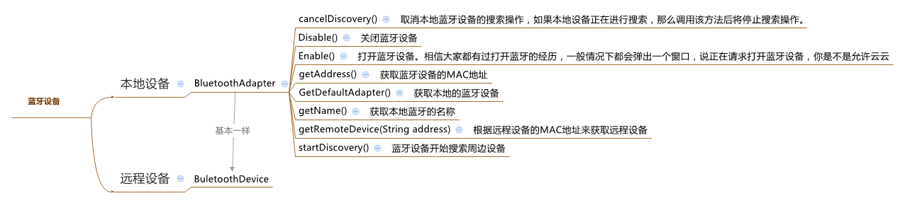 1、蓝牙设备-->蓝牙设备主要包括本地设备和远程设备,和他们相关的函数如下图: