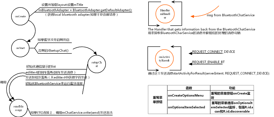 1、BluetoothChat.java-->如下图在BluetoothChat中进行了获得蓝牙设备、开启蓝牙设备、并启动BluetoothChatService进行连接,然后用Handler mHandler进行接收从BluetoothCharService的消息并作出相应的处理。在这里的list是为了显示蓝牙设备的通话信息,一条一条显示;edittext用来获取本地输入的消息,按回车或者send按钮都可以触发sendMessage进行发送消息;此外,由于需要手动搜索蓝牙设备并选择要链接的蓝牙设备,所以这里重写了菜单按钮监听,包括onCreateOptionsMenu和onOptionsItemSelected,在onOptionsItemSelected中对san和discoverable进行分别处理。