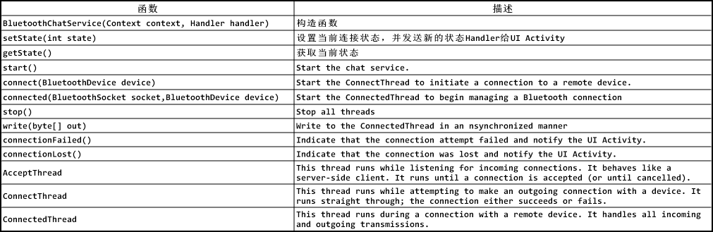 2、BluetoothChatService-->上面说过在setupChat中最后实例并初始化BluetoothChatService进行蓝牙连接,下面来大致分析下该类的构成及功能:该类主要实现连接蓝牙的3个状态,分别用3个线程来处理:①AcceptThread线程,就像service-client中的accept函数,一直等待,知道接受一个连接;②ConnectThread线程负责连接;③ConnectedThread线程负责和远程蓝牙设备进行通信,并将收到和要发送的信息通过handles进行传递。这里我们主要分析连接之后的数据交换过程,对于等待连接、尝试连接这里不做详解~