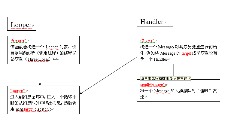 从这个图看到Handler和HandlerThread类都有一个Looper成员变量。而且,Handler和Looper都有成员变量MessageQueue,下面我们看看Looper类和Handler类的作用。