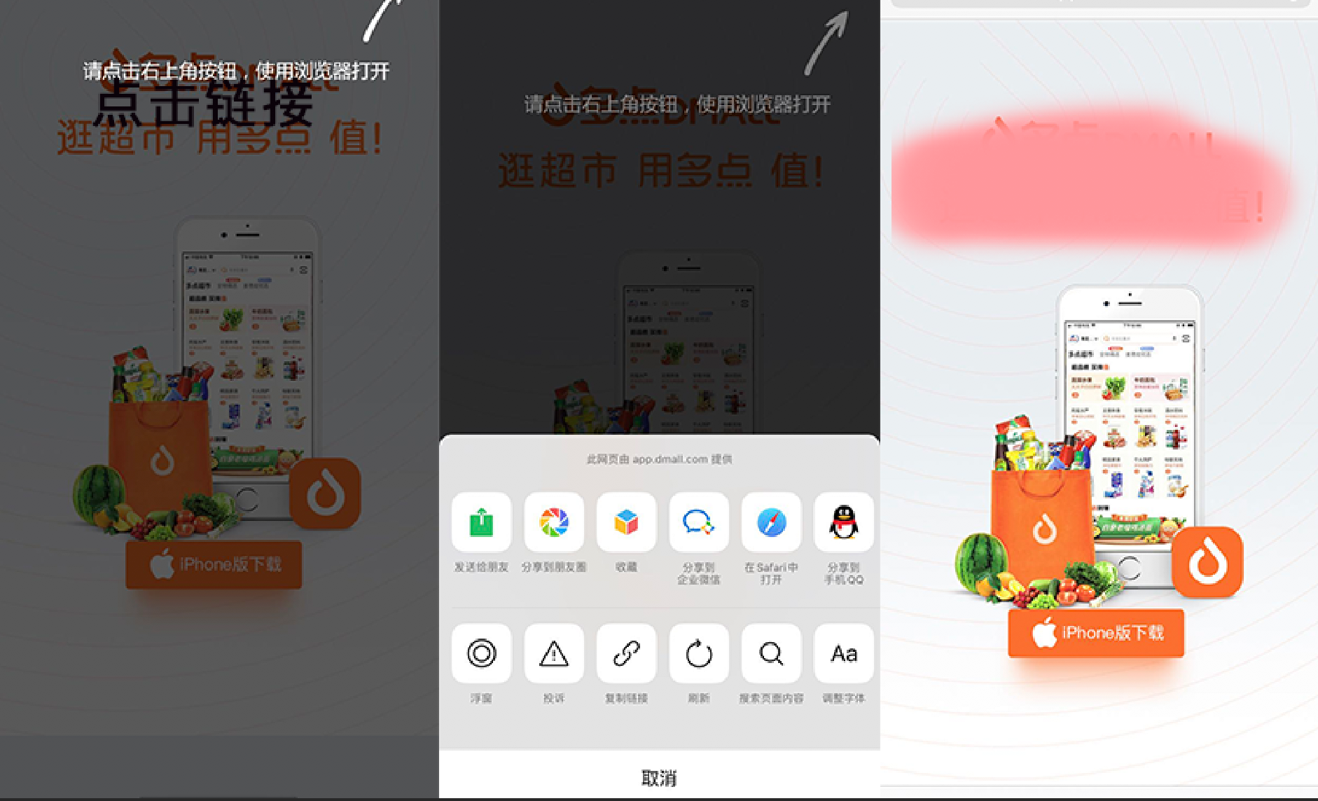 微博、支付宝、钉钉等社交平台中点击分享推广链接,打开落地页,无法快速下载,而是提示用户”在浏览器中打开“,增加用户操作,大量用户放弃下载安装,大大降低App安装率,造成App推广转化率低。