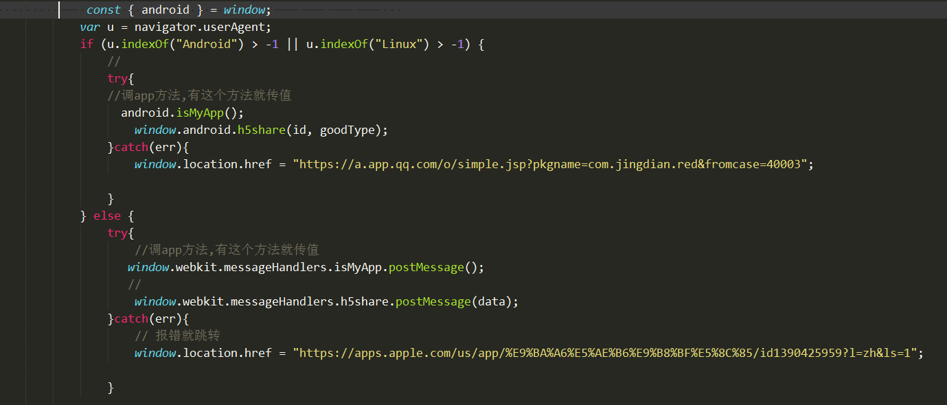 思想:如果能调到这个方法说明在APP内点击则提供h5share(id, goodType)方法给安卓与IOS继续执行,如果调不到报错了,则说明不是APP内打开的抛出异常执行跳转到链接去下载,如果手机有APP会直接打开。其中id, goodType为方法传值