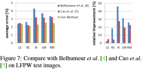 Belhumeur et al. and Cao et al. reported results on LFPW test images, and the latter defined the current state-of-the-art on these images. We also evaluate our algorithm on the 249 LFPW test images in order to compare with the two best methods on this dataset. Figure 7 shows the comparison results on average errors and our relative accuracy improvements over the two methods. More than 20% relative accuracy improvement is achieved for nose tip and two mouth corners.