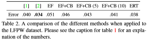 Baselines: To accurately benchmark the performance of our proposed method, an ensemble of regression trees (ERT) we created two more baselines. The first is based on randomized ferns with random feature selection (EF) and the other is a more advanced version of this with correlation based feature selection (EF+CB) which is our reimplementation of. All the parameters are fixed for all three approaches.