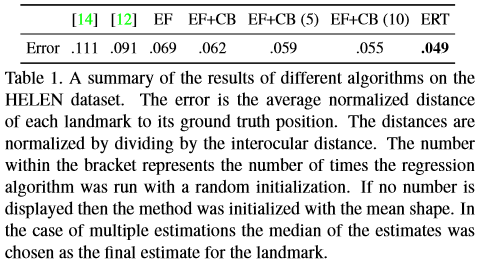 评估指标:The error is the average normalized distance of each landmark to its ground truth position. The distances are normalized by dividing by the interocular distance.