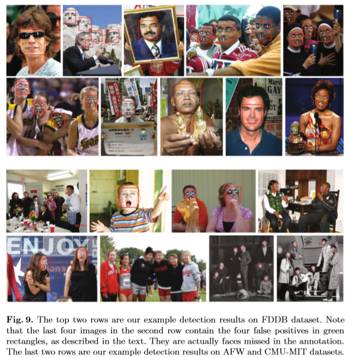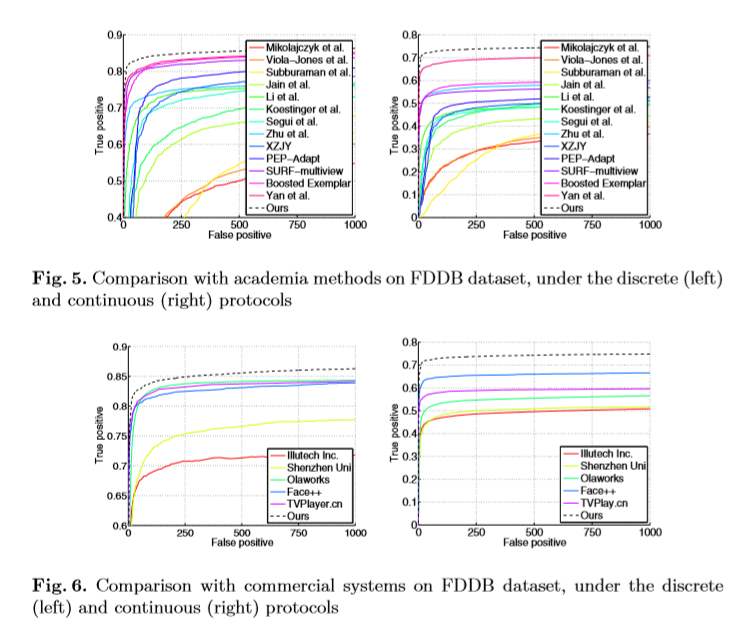 Our detector also outputs aligned face shapes as a by product. We evaluate the alignment accuracy on AFW dataset using the same settings in. We compare with the following methods: 1) face.com alignment system; 2) Zhu et al.; 3) method in. The results of first two methods are from. The last is the state-of-the-art face alignment method. We implemented this method and used our detected faces as its input. Figure 8 shows that our face alignment accuracy is comparable to that in, not surprisingly, and is better than the first two.
