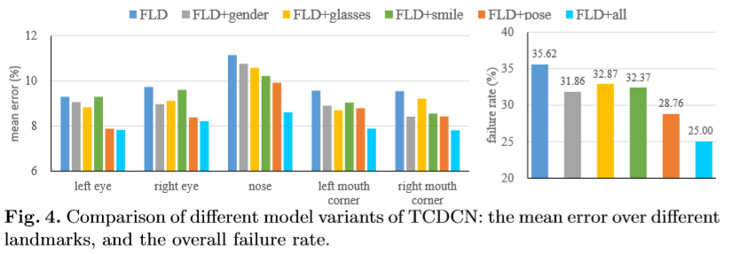 It is evident from Figure 4 that optimizing landmark detection with related tasks are beneficial. In particular, FLD+all outperforms FLD by a large margin, with a reduction over 10% in failure rate.