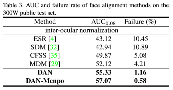 We compare the DAN model with state-of-the-art methods on all of the test sets of the 300W competition data.