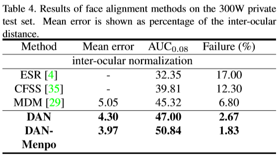 评估指标-Evaluation metrics: In all cases, we report our results on two popular metrics, including mean error and failure rate. The mean error is measured by the distances between estimated landmarks and the ground truths, normalizing with respect to the inter-ocular distance. Mean error larger than 10% is reported as a failure.