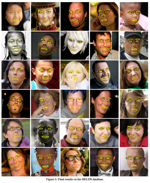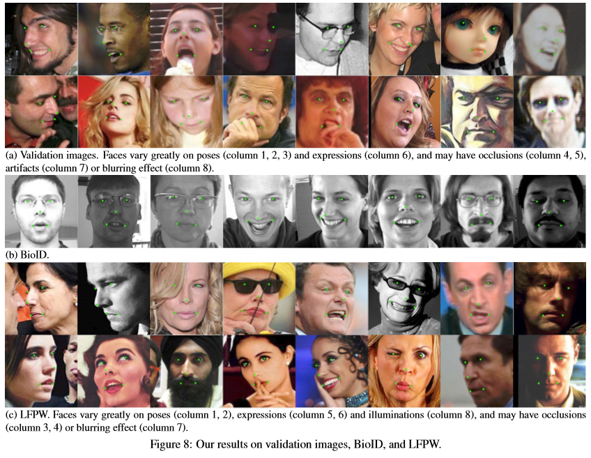 Figure 7 gives some examples taken from the validation set. Our system is able to handle images that contain great variation in pose and lightening condition. It can predict the shape of the face even in the presence of occlusion. Despite the success, chance for further improvement still exists, especially for the points on the eyebrow or face contour.
