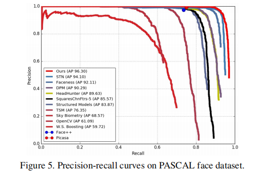 PASCAL人脸数据集: 它是从PASCAL个人布局数据集的测试集中收集的,由1335张具有大的面部外观和来自851张图像的姿势变化的面部组成。图5显示了该数据集上的精度-召回率曲线。我们的方法明显优于所有其他方法和商用人脸检测器(如SkyBiometry,Face++和Picasa)。图7(b)显示了PASCAL人脸数据集的一些定性结果。