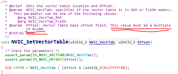 首先查看NVIC_SetVectorTable函数的实现代码,非常简单,首先是对参数进行正确性判断,然后就是对一个寄存器进行赋值。在判断参数正确性的代码中并没有找到有关于0x200的代码,那么问题肯定就在这个寄存器赋值上了。具体代码如下: