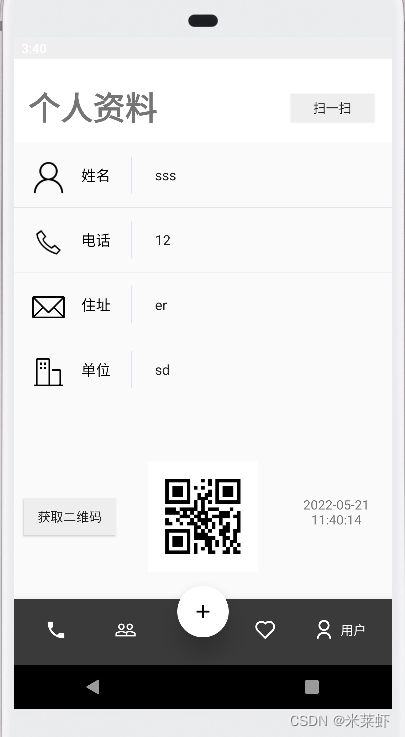 ❥ 用户登录后个人资料设计、获取二维码并进行扫码添加,可以添加联系人,添加结束之后可以对联系人信 息进行修改和查询。
