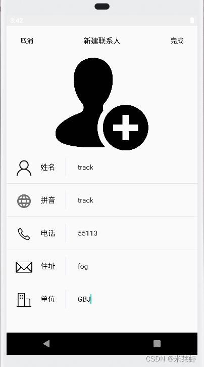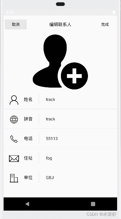 ❥ 新建联系人信息的时候,联系人的主要信息有姓名、电话、住址和单位这些。查询的时候,我们能依据这些信息进行模糊查询。