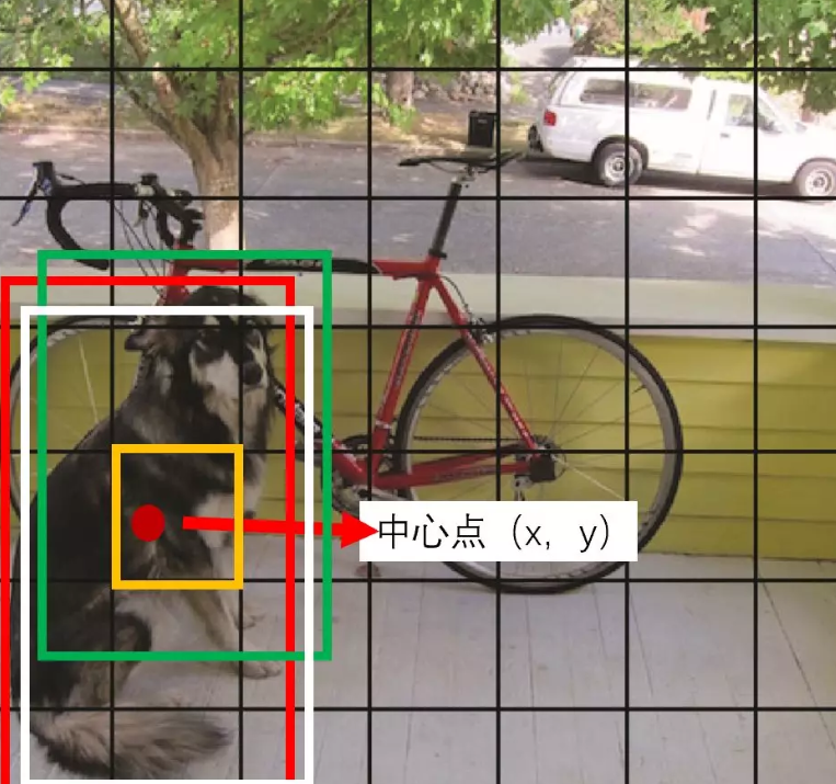 这句话给了其标准答案,物体的“中心”落在哪个网格中,哪个网格就负责训练这个框(类别和坐标)。这句英文大家都能看懂,但是实际呢?看看下面这张图: