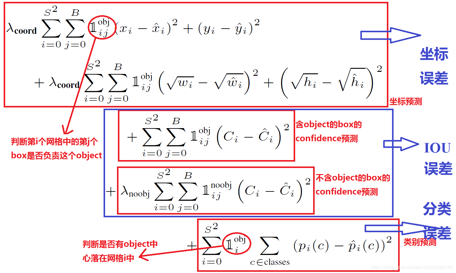 这里详细讲一下 l o s s loss loss f u n c t i o n function function。在 l o s s loss loss f u n c t i o n function function中,前面两行表示 l o c a l i z a t i o n localization localization e r r o r error error(即坐标误差),第一行是box中心坐标(x,y)的预测,第二行为宽和高的预测。
