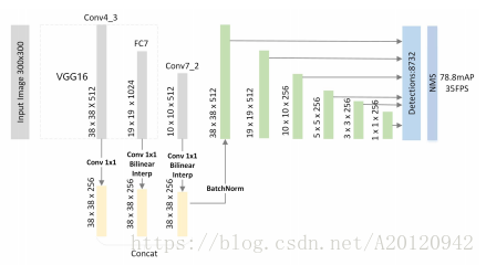 本文是对SSD或DSSD的一个改进。DSSD是反卷积并与对应的前向层相加,而本文则每一层直接反卷积到相同的大小,中间不做任何的相加操作,达到相同大小之后,在concat融合,再卷积。