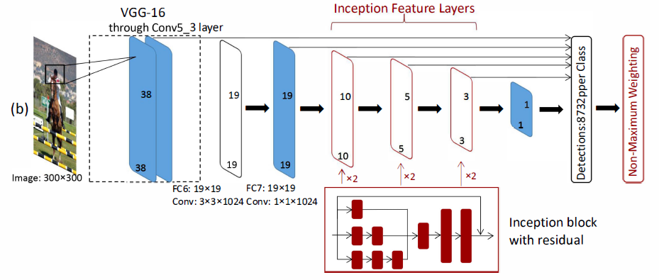 1. 我们在SSD的结构中引入了Inception building block来提升它的性能表现,在不增加其复杂度的情况下,它能够捕获更多的信息。