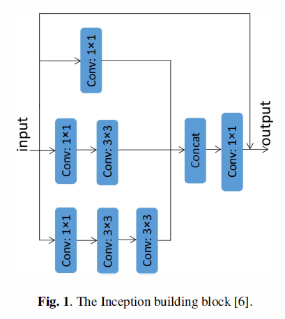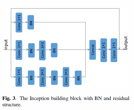 这里,不同大小的卷积核是堆叠的,它们有不同的接受域。特别地,我们堆叠1*1卷积层,3*3的卷积层,5*5的卷积层,代替原来的3*3的卷积层。5*5的卷积层用了一串两个3*3的卷积层代替。这样,我们可以获得更多的目标细节。我们减少了Inceptionblock上每层的特征图的数量,使得与原来的特征图的总数保持一致。为了能反应不同比例的接受域,我们对每种类型的卷积(conv1x1,conv3x3,conv5x5)的输出赋予不同的权重,权重w={1,2,1}。我们对3*3的卷积层设置w=2,为其它得卷积层赋予权重w=1,我们对Inception 块的每一个卷积层使用BN,使用两个1x1的卷积层在顶部。我们修改后的Inception块如图3.