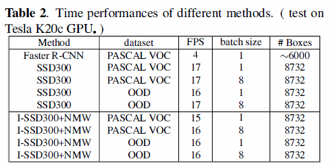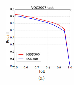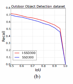 上图(b)显示了在OOD数据集上的recall,当I0U是0.5的时候,I-SSD的recall是71.8%,当IoU增加的时候,I-SSD的recall比SSD相对高一点,I-SSD的精度更高,因为它使用了更多类型的卷积核,这些卷积核包含更多的目标信息。仍然,I-SSD在这些数据集上能够达到实时,结果见上表2。
