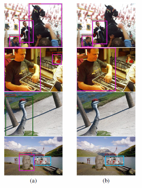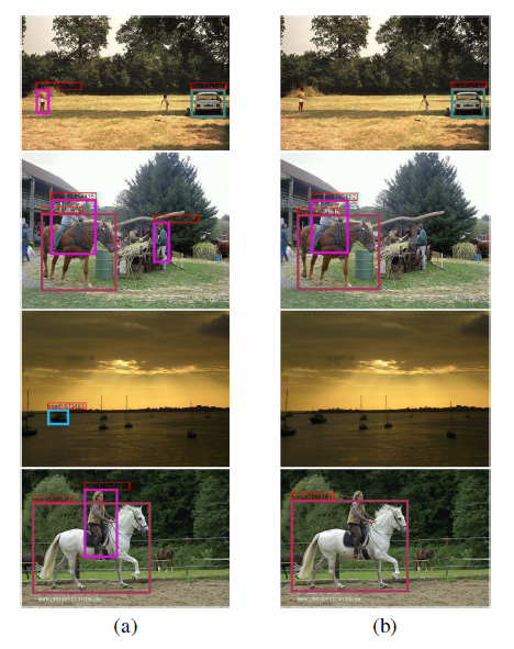 上图是I-SSD和SSD在VOC 2007测试集上的样例,不同颜色的框框代表不同的类别,置信阈值为0.6,第(a)列显示的是I-SSD的检测结果,第(b)列显示的是SSD的检测结果。I-SSD在小目标的识别上具有很强的能力,另外,我们的模型测试速度仍然很快,在Tesla k20c GPU上是16FPS, SSD是17FPS.如表2.