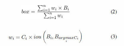 其中,n是b-boxes的重量,iou(B_i,B_(arg max┬i〖C_i 〗 ))是第i个b-box的IoU和具有最大置信度的b-box, w是每个b-box的权重。