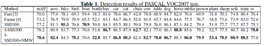 表1显示了我们实验方法的mAPs,使用的是PASCAL VOC2007数据集,Fast R-CNN使用Selective Search去产生提议,把整张图片和提议作为VGG16的输入用于识别和回归。Faster R-CNN使用一个更高效的区域提议算法,叫做RPN网络。Fast和Faster R-CNN都使用分别率为1000*600的图片为输入图片。而I-SSD和SSD使用一个单个网络,输入的大小为300*300.
