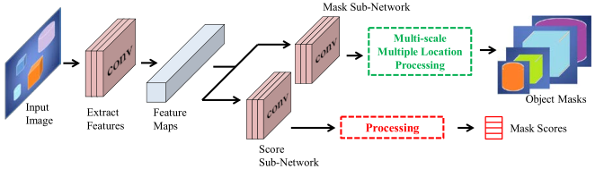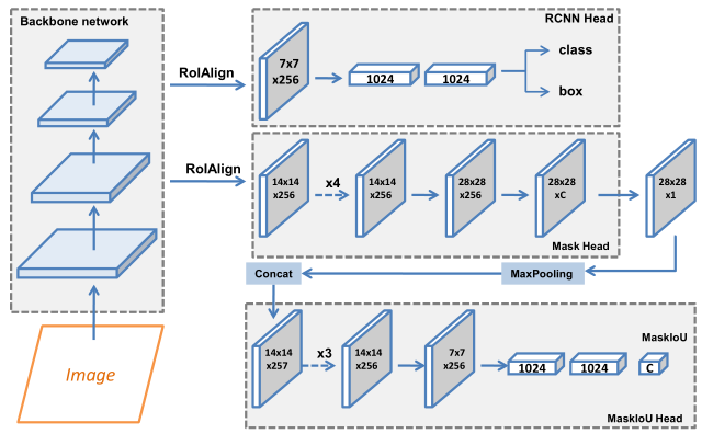 在Mask R-CNN上增加了一个额外的Mask Head模块,学习Mask-iou一致的Mask分数。Mask R-CNN与MaskIoU Head结合,结合实例特征和预测的Mask。这种安排用于预测输入掩模和ground truth掩模之间的损失。图下显示了Mask Scoring R-CNN架构。