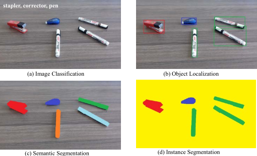 分类可被定义为预测图像中一个对象的类别,或根据其分类分数提供图像中对象的类别列表。目标检测或定位是一个从粗推理到精推理的渐进过程,它不仅提供了图像目标的类别,还以边界框或中心的形式给出了分类后的图像目标的位置。语义分割的目的是通过对图像中每个像素点的标签进行预测,得到精确的推理结果。每个像素都根据其所在的对象或区域进行分类标记。按照这个方向,实例分割为属于同一对象类的不同对象实例提供了不同的标签。因此,实例分割可以定义为寻找目标检测的任务同时解决语义分割。将每个分割后的对象分解为各自的子成分。下图描述了图像分割的演变过程。