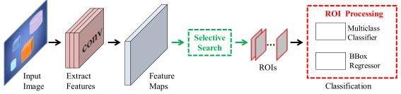RCNN集成了AlexNet和使用选择性搜索技术的区域方案。RCNN模型的训练包括以下步骤。第一步涉及计算使用选择性搜索获得的类不可知区域建议。下一步是CNN模型微调,包括使用区域建议微调预先训练的CNN模型,如AlexNet。接下来,利用CNN提取的特征来训练一组类特异性支持向量机(SVM)分类器,该分类器取代了通过微调学习的softmax分类器。然后使用CNN获得的特征对每个对象类进行类特异性边界盒回归训练。