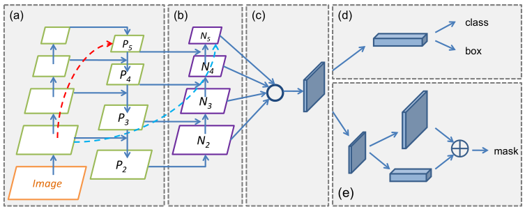 提出了一种用于实例分割任务的基于框架,旨在提高信息的流动。改进了深层网络的特征层次,在底层使用与定位相关的特定信号。这个过程称为自底向上路径增强。它使得底层和深层网络顶层特征之间的信息路径更短。还提出了一种被称为自适应特性池的技术,它将特征网格和所有层次的特征联系起来。由于这种技术,在每一级特征的相关信息流到后续子网络用于产生建议。一个备用的分支段捕获各种提议视图,以增强生成掩码的预测。