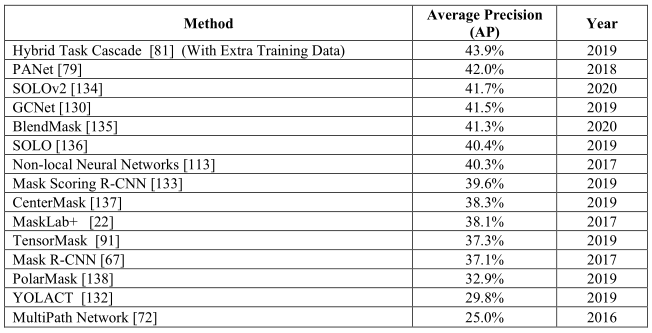 小对象的实例分割仍然是一个问题。CNN按层次计算特征,因此在默认情况下,特征层中的下采样层会形成一个内建的多尺度金字塔,进而生成不同分辨率的特征图。这会导致一些问题。例如,CNN层越深,接受域越广,对位姿、变形、光照等变化的鲁棒性越强,但分辨率越低,细节丢失。相对而言,较低的CNN层接收域较窄,细节更丰富,但分辨率更高,对语义的敏感性更低。对象的语义属性出现在不同的层中,而这些层又取决于对象的大小。因此,如果一个物体很小,它的细节在浅的CNN层中会更少,同样的细节在较高的层中几乎会消失。这个问题使得小对象检测非常具有挑战性。各种各样的技术已经被提出来解决这个问题,例如带孔卷积和提高特征的分辨率。然而,这些技术导致更高的计算复杂度。此外,如果对象很大,那么它的语义概念将在更高的层中得到反映。许多技术已经被开发出来,通过使用不同的CNN层来提高检测精度。