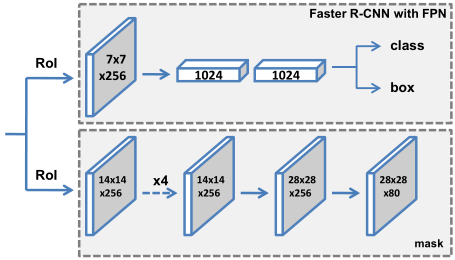 Mask R-CNN,一个相对简单和灵活的实例分割模型。该模型通过目标检测进行了实例分割,同时生成了高质量的掩模。通常,Faster R-CNN有一个用于识别物体边界框的分支。Mask R-CNN并行添加了一个对象蒙版预测分支作为改进。使用FPN主干的head架构如图所示。